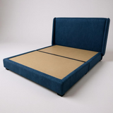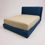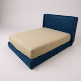 La estructura está recubierta en la misma tela, brindando uniformidad estética, mientras que la superficie de soporte para el colchón está formada por paneles rígidos, ofreciendo estabilidad y resistencia.